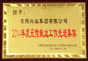 ·2014年12月,授予興業(yè)集團2014年底無償獻血工作先進集團稱號